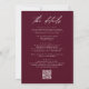 Elegante, convites de casamento todos em um com seus nomes e informações da cerimônia de casamento na frente, em letras brancas com um fundo burgundy. Um moderno roteiro de caligrafia completa o olhar desse convite de casamento chic burgundy. Personalize a parte traseira dos convites para casamento por caligrafia com detalhes de casamento, como informações de recepção, acomodações de hotel, instruções de RSVP e site de casamento. Adicione o link desejado do site de casamento ao modelo de Código QR fornecido para que seus convidados possam facilmente RSVP on-line e exibir informações adicionais sobre o casamento. Este convite de casamento de código QR burgundy é perfeito para casamentos formais e casuais de qualquer estação.