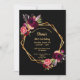 Na frente: Um convite para uma 18ª festa de aniversário. Um fundo preto chic com uma falsa estrutura geométrica dourada. Decorados com flores, rosas e penas do estilo "boho" escuras e burguesas. Modelos para um nome e detalhes da festa. O nome é escrito com um script de estilo manuscrito, letras ouros coloridas. Fundo preto e grandes rosas peludas em burgundy e roxo.