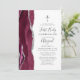 A borda esquerda deste elegante e moderno convite da primeira comunhão apresenta uma borda vermelha e borrifada de cor-d-água cortada com falso brilho prateado. Uma cruz de folha prateada falsa aparece acima do texto personalizável, que combina escrita manual, chapa e fontes itálicas em cinzas de carvão em um fundo branco. O lado inverso apresenta um design de burgundy e agate prateado.