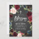 Convide um convidado com este convite para bênção floral de bebê. Apresenta ilustrações de cor d'água de burgundy, blush e fundo floral azul sobre fundo fino de quadro-negro. Este convite floral burgundo é perfeito para as bênçãos do outono e do tema "Boho". Personalize adicionando seus próprios detalhes.