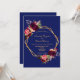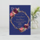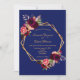 Na frente: Um fundo azul escuro com uma falso quadro geométrico dourado. Decorados com flores, rosas e penas do estilo "boho" escuras e burguesas. Modelos para seus nomes e detalhes do casamento. Os nomes são escritos com um moderno estilo escrito à mão, letras azuis Back: fundo Marinho azul colorido.