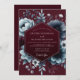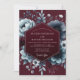 Deep burgundy serves as a rich backdrop for ethereal blooms in cool, muted tones. This design evokes a sense of dramatic romance with its opulent floral arrangements and dark, atmospheric feel. A sophisticated choice for a memorable occasion.