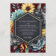 Embrace a mood of dramatic romance with this opulent artistic design. Inspired by classic still-life paintings, the artwork features a lush and layered botanical composition. A rich palette of deep burgundy, charcoal, and slate blue provides a moody backdrop for vividly rendered golden ochre dahlias and chrysanthemums.