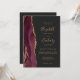 A borda esquerda deste convite de casamento moderno e elegante apresenta uma borda de ágata em aquarela burgundy aparada com brilho dourado falso. O texto personalizável combina escrita à mão em dourado, fontes copperplate e itálico em um fundo cinza carvão escuro. O verso fornece espaço para detalhes do casamento em um fundo escuro sólido, juntamente com um código QR que os convidados podem escanear para visitar seu site e responder, o que economiza o custo de impressão e envio de cartões de resposta separados.
