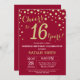 Surpreenda o 16º Convite de Aniversário com o Vermelho Burgundy e o Dourado Fundo de Diamante Glitter. Dourado Confetti.Aniversário de crianças. Adolescente Adolescente ou Garota Aniversário.