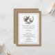 Um convite de casamento com uma ilustração de flores roxas e verde, arranjado em torno dos arbustos de um dólar e pomba. Personalize com seu dentro inicial. Personalize o texto com detalhes da sua ocasião. A redação é dos pais da noiva. O fundo é uma burlap inspirada com design de renda na frente.