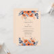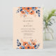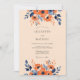 A warm palette of burnt orange and deep navy blue creates a sophisticated atmosphere for a fall event. Delicate watercolor blossoms, resembling poppies and anemones, decorate the top and bottom in a graceful arrangement. Indigo foliage and soft peach accents provide a rich contrast against the warm cream backdrop.