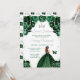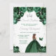 Este convite de aniversário de sweet sixteen elegante e glamoroso apresenta uma bela princesa com cabelos castanhos em um vestido de gala verde escuro. O texto combina caligrafia manuscrita e fontes modernas sem serifa para uma aparência clássica e sofisticada. Os arranjos florais, borboleta e confetes prateados criam a combinação perfeita de rústico e chique.