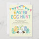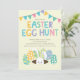 O nosso convite de festa de Páscoa com coelho de caça ao ovo fofo apresenta o coelhinho mais fofo cercado por ovos de Páscoa em um fundo amarelo claro com uma faixa colorida. Personalize com suas informações pessoais e você estará pronto para ir.