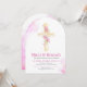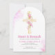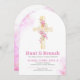 Caça à páscoa e convite para brunch com uma cruz de madeira embelezada com verde e um buquê de aquarelas cor-de-rosa. Personalize com seus próprios detalhes de evento. Este convite para Páscoas diz que ele se ergueu no verso e também apresenta o único fundo de lavagem de cor d'água cor-de-rosa e cor d'água. Cruzamento de madeira com flores cor-de-rosa orquídeas florais cor-de-água pintura à mão e design exclusivamente por Sarah Trett e apenas para www.mylittleeden.com