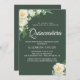 Celebre um 15º aniversário mágico com este convite encantador de Quinceañera. Perfeito para um evento de verão ou outono, este design moderno boho exibe folhas verde-esmeralda, sage e oliva em aquarela, acentuadas por flores brancas delicadas para um toque de elegância.