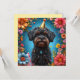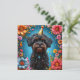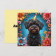 Um cachorro preto fofo vestindo um chapéu de festa dourado, cercado por flores coloridas e decorações. A atmosfera alegre destaca a essência comemorativa e divertida, perfeita para visuais temáticos festivos e alegres.
