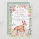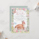 Este convite de chá de fraldas giro e caprichoso apresenta um fundo rosado poeirento ou rosa rosa, semelhante ao papel texturizado ou ao papel de reciclado. Um jardim floral, como um quadro, borda a área de texto com flores cor-de-rosa e creme, e acentuando o verde. Duas raposas para bebês e uma raposa-mãe são colocadas na parte inferior. As imagens são impressas em um estilo de pintura a aquarela.