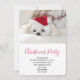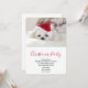 Convite de festa de Natal com uma foto adorável de um cachorrinho branco fofo usando um chapéu de Natal vermelho.