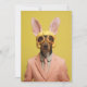 Um dachshund elegante vestido para a Páscoa com um terno rosa pastel, gravata listrada e capacete amarelo com orelhas de coelho, exalando charme e capricho contra um fundo amarelo brilhante. Uma mistura perfeita de elegância e humor para uma celebração festiva de Páscoa.