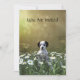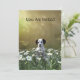 Um filhote dalmata branco e preto fica quieto num campo de margaridas brancas.
