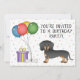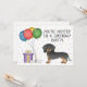 Design do tema de aniversário bonito com a ilustração original de Destei de um cão da raça Dachshund, de casaco preto e bronzeado. Ao lado do cão há balões coloridos de aniversário amarrados num osso de cão e uma caixa de cor roxa e amarela. O fundo tem um padrão lúgubre de confete pastel colorido sobre um fundo branco. Personalize as áreas de texto de exemplo com os detalhes do seu evento.