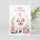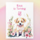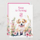 Um doce cachorrinho rodeado por flores cor-de-rosa com convites de festas de aniversários de ilustração de aquarela para uma menina.