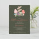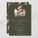 O nosso cogumelo está a caminho! Chamas de fadas de fadas de outono bonitas, cogumelos chás de fraldas, com pequenos cogumelos bonito e bonitos, em vermelho, rosa, azul, roxo e rosa e um cartaz de madeira que diz chá de fraldas em verde escuro. O chá de fraldas perfeito convida para a sua festa de outono com um tema de fada ou floresta.