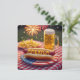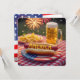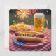 Um cachorro-quente com a palavra "América" em mostarda está em um prato de bandeira patriótica, acompanhado de batatas fritas e uma caneca de cerveja em uma toalha de mesa xadrez vermelha e branca