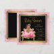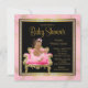 Convite de chá de bebê de menina étnica com adorável bebê étnica vestindo tutu rosa franzido e colar de pérolas sentada em uma bela cadeira rosa e dourada sobre um lindo fundo de renda preto, rosa e dourado. Este convite de chá de bebê elegante rosa e dourado é facilmente personalizado para o seu evento, basta adicionar seus detalhes no estilo de fonte de sua escolha. Você também pode alterar a cor do fundo. Este é um design impresso sem renda real, diamantes, ouro, glitter, etc.