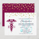 Convite para uma celebração de formatura de enfermagem. Projetado com pontos de confete dourado falso ao longo da parte superior. Um símbolo de caduceu vermelho arroxeado com as letras R N em cada lado. Um estetoscópio azul pastel por trás do texto da festa.