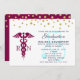 Convite para uma celebração de graduação em enfermagem. Projetado com pontos de confete falso dourado ao longo da parte superior. Um símbolo de caduceu vermelho arroxeado com as letras R N em cada lado. Um estetoscópio azul pastel por trás do texto da festa.