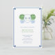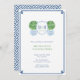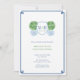 Este inteligente design azul, branco e verde apresenta um monograma de um casal com uma bola de topiaria de buxo em um vaso de planta de jarro de gengibre em cada lado. Isto é cercado por uma borda "Greek Key" e no verso há um reforço com padrão "Greek Key". Configurei o modelo para um Brunch de Recém-Casados, mas todos os campos de texto são personalizáveis de acordo com as suas necessidades. No verso, você pode alterar a cor de contraste (mostrada aqui como azul escuro) para qualquer cor que desejar, entrando na ferramenta de design (sob a área de personalização de texto, clique em "personalizar ainda mais") e, em seguida, alterando a cor de fundo no verso.