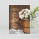 Convide os convidados para celebrar os noivos recém-casados na manhã após a cerimônia de casamento no estilo rancho com o convite casual, porém elegante, para o brunch pós-casamento no estilo country, Wooden Bucket e White Daisies Country Barn. Este convite personalizado rústico e chique para o café da manhã ou almoço após o casamento em uma festa em um celeiro de fazenda apresenta uma encantadora fotografia floral digitalmente aprimorada de um balde de madeira cheio de flores brancas de margarida e um fundo de madeira de celeiro marrom desgastado.