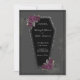 Escuro e lindo, este convite de casamento em forma de caixão é perfeito para um casamento gótico ou de Halloween. O caixão tem brilho cinza ao redor das bordas e rosas roxas com folhas verdes douradas e cinzas. Veja nossos itens góticos coordenados.