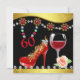 Calçados Vermelhos Personalizados Elegantes, Vinho e Joias 60º Convite de Aniversário. O design tem borrão colorido, rochas, brilho, flor, vidro de vinho com fundo preto e dourado. Perfeito para meninas que amam calçados, reluzentes e faíscas!