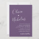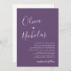 Monograma do Script de Caligrafia Moderna Chic Minimalista Nome do Monograma do Código QR Purple Mauve Tudo em Um Cartão de Convite de Casamento. Apresentando um nome monograma enorme em um script de fonte de rabo de swash com letras elegantes e manuscritas em branco sobre fundo de cor mauve, roxo empoeirado ou lavanda. Um pouco de emoção entre os primeiros nomes. O lado inverso do convite contemporâneo consolida todos os "detalhes do casamento" essenciais normalmente encontrados em cartas individuais dentro do pacote do casamento. Este convite de casamento moderno e econômico inclui um modelo gráfico de código QR no verso, que você pode personalizar com seu próprio código (ou remover se não for necessário). É fácil personalizar. Ao incorporar um código QR, você pode salvar papel enquanto ainda permite que os convidados acessem detalhes, RSVP ou ambos. Crie um ambiente caloroso e convidativo para os seus hóspedes participarem na alegria do seu dia especial. Faça seu pedido agora e garanta que sua celebração de casamento seja realmente inesquecível!