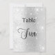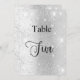 O número da tabela é escrito com um script de estilo elegante com letra manual. Letras negras, um fundo de prata sujo com poeira brilhante falsa, faíscas.