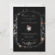 Este design de convite para o casamento chic apresenta uma vida floral holandesa do século 18, incluindo tulipas brancas, vermelhas e douradas e flores silvestres, sobre um fundo preto com etiqueta central personalizada, gráficos florais complementares e caligrafia personalizada elegante. O dorso apresenta uma coroa floral opcional com modelo de monograma.