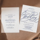 Esta caligrafia romântica de marinho, tudo num convite de casamento, é perfeita para um casamento simples. O clássico design moderno apresenta espirais ricos e turbilhões brancos com magnífica e elegante tipografia à mão. Salve o papel, incluindo os detalhes na parte traseira do convite de casamento, em vez de em um cartão de cercado separado. Inclua as informações de RSVP também se seu convidado estiver respondendo eletronicamente (opcional).
