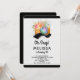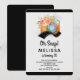 Um convite de aniversário com tema de fotografia. O texto diz Oh Snap! Com os detalhes personalizados da sua festa. Criado com uma ilustração em aquarela de uma câmera laranja com um buquê de flores e uma tira de filme ondulada em preto e branco.