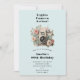 Convite de aniversário com uma câmera estilo vintage decorada com flores. Cores pastéis rosa, creme e verde.