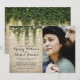 Convites de casamento de conto de fadas mágico com um fundo de parede de tijolo de pedra rústica, uma foto do casal noivo, videira de hera verde, luzes cintilantes de corda e um modelo de casamento moderno.