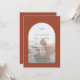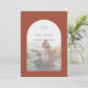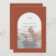 Convite moderno de casamento, com seu monograma junto com seus detalhes sobre sua dentro de foto favorita de um arco sobre fundo de ferrugem. O modelo inclui uma camada para permitir que o texto apareça sobre a sua imagem e possa ser removido na ferramenta de edição de design. Esta simples, mas elegante design com cores do deserto terrestre é excelente para um casamento no estilo boho no verão ou outono.