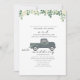 Ilustração de um caminhão azul vintage decorado com verde, flores e latas de estanho sobre um fundo branco com texto de cinza e design floral verde no topo.