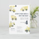 Tornar o quarto aniversário do seu filho inesquecível com este convite de caminhão de construção moderno. O design apresenta ilustrações aquáticas de caminhões de lixões amarelos, em um simples fazer branco de fundo, é divertido e encantador, enquanto a frase "Dump All and join the staff" acrescenta um elemento lúdico ao cartão. Use as ferramentas de design para personalizar o texto, as fontes e as cores! Também disponível como download digital para convites instantâneos.