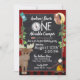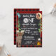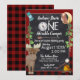 Um adorável convite de aniversário para acampar, rústico, com tema de xadrez de búfalos vermelho e preto e design. Encantador Um campista, acampamento, convite de aniversário temático ao ar livre para o primeiro aniversário do bebê ou mude a redação para qualquer idade ou ocasião. Moso bonito com uma fogueira no bosque e flecha para uma formulação separada. Uma mochila de caminhantes e bússola também decoram este um feliz convite para o tema da festa de aniversário de acampamento.