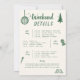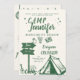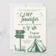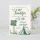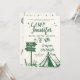 Um modelo de convite de fim de semana moderno, elegante e festa de solteira, com tema de acampamento, com desenhos de uma tenda, anel, mapa, anel, violão e fogo, e um posto de sinais para a data, além de um roteiro manuscrito. Um convite de caligrafia, uma escolha elegante e divertida para um final de semana de glamour de solteira, acampamento, caminhada ou qualquer lugar ao ar livre, em um verde de floresta ao ar livre, suave e tranquilo e num estilo moderno.