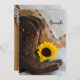 Convide os convidados para celebrar a recém-casada e o noivo na manhã após a cerimônia de casamento com o encantador Convite de Café da Manhã Pós-Casamento Country Sunflower e Lace no estilo Western. Este convite casual, porém sofisticado, para o Desjejum ou Almoço pós-casamento em estilo rancho personalizado apresenta uma fotografia floral encantadora de botas de cowboy de couro marrom, flor de girassol amarelo, véu de noiva branco e um lenço de mão com acabamento em renda bege vintage com fundo de madeira de celeiro rústico e marrom desgastado pelo tempo. Inspiração perfeita para um evento de celebração de festa de casamento informal no celeiro.