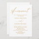 Este aviso de cancelamento de casamento em cores modernas branco e dourado apresenta uma elegante caligrafia em ouro falso e informa aos convidados que a cerimônia foi cancelada devido a eventos imprevistos, e que você entrará em contato com eles quando for remarcada.