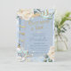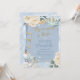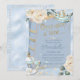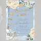 Este convite de festa personalizado apresenta um tema caprichoso de conto de fadas da Cinderela. O fundo tem um design de folha de alumínio azul suave, acentuado com rosas brancas e diamantes em torno das bordas. Uma capa de livro de conto de fadas antigo é impressa no centro com a frase "Era uma vez" impressa em um design de brilho dourado. Uma imagem de uma tiara de princesa é impressa no canto superior direito, e uma carruagem de abóbora é representada no canto inferior esquerdo.
