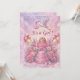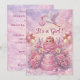 Dê as boas-vindas à sua doce bebê com este encantador convite de Chá de Bebê "É uma Menina"! Este design sonhador apresenta uma cegonha branca clássica carregando um precioso embrulho rosa através de um céu de nuvens macias como algodão doce e luzes de fada brilhantes. No centro, uma linda bebê com um laço rosa delicado no cabelo repousa dentro de uma rosa rosa florida, cercada por arranjos florais elegantes, um bolo de celebração em camadas e sapatinhos de tricô rosa.