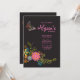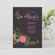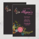 Um convite encantador com uma borboleta caprichosa e um buquê de coloridas flores de fantasia contra um fundo preto. Muito adequado para mulheres de qualquer idade.