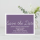 Anúncio Caprichoso de Salvar a Data em roxo e branco com um design de tipografia simples e divertido. Este convite moderno para salvar a data é fácil de personalizar com os detalhes do seu casamento. Para mais opções de personalização, clique no botão Personalize.