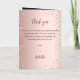 Um fundo gradiente em rosa dourado falso com diamantes rosa. O nome é escrito com uma fonte moderna de letras à mão em cor rosa dourado escuro. O número 90 é escrito com uma fonte estilo balão, cursiva. Texto de boas-vindas, foto, cardápio e um agradecimento no verso.